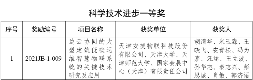 日前,2021年天津市科學(xué)技術(shù)獎獲獎名單公布,由天津安捷物聯(lián)科技股份有限公司聯(lián)合天津大學(xué)、天津師范大學(xué)、國家會展中心(天津)有限責(zé)任公司申報的《邊云協(xié)同的大型建筑低碳運維智慧物聯(lián)系統(tǒng)的關(guān)鍵技術(shù)研究及應(yīng)用》項目,榮獲“天津市科學(xué)技術(shù)進(jìn)步一等獎”。