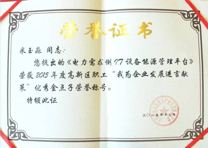 表彰大會(huì)上,安捷電力副總經(jīng)理覃嶺從天津大學(xué)校領(lǐng)導(dǎo)張力新手中接過“優(yōu)秀社會(huì)服務(wù)集體”的獎(jiǎng)牌。這份榮譽(yù)不僅是天津大學(xué)對于安捷電力優(yōu)秀服務(wù)質(zhì)量的高度肯定,更是集團(tuán)在2015年繼“濱海新區(qū)科學(xué)技術(shù)進(jìn)步一等獎(jiǎng)、天津市科學(xué)技術(shù)進(jìn)步二等獎(jiǎng)”之后收獲的又一項(xiàng)殊榮。在安捷的榮譽(yù)墻上,現(xiàn)已大大小小掛滿了近二十種集團(tuán)榮譽(yù):最佳雇主獎(jiǎng)、先進(jìn)基層黨組織、高新技術(shù)企業(yè)、天津市認(rèn)定企業(yè)技術(shù)中心,天津市專利試點(diǎn)企業(yè)、院士專家工作站、天津大學(xué)電力新技術(shù)研究開發(fā)實(shí)驗(yàn)室、華北電力大學(xué)研究生工作站。安捷與中科院、天津大學(xué)、華北電力大學(xué)等單位和高校開展產(chǎn)學(xué)研合作,并與倪光南院士成立了院士專家工作站,共同助力創(chuàng)新發(fā)展。更加值得欣喜的是,在年末之際,由海諧集團(tuán)副總經(jīng)理米玉淼和海諧集團(tuán)創(chuàng)新中心副主任王立波分別提出的《電力需求側(cè)IT設(shè)備能源管理平臺(tái)》和《智能暖通空調(diào)自控管理平臺(tái)》更是榮獲了2015年度高新區(qū)職工“我為企業(yè)發(fā)展進(jìn)言獻(xiàn)策”最佳金點(diǎn)子榮譽(yù)稱號。