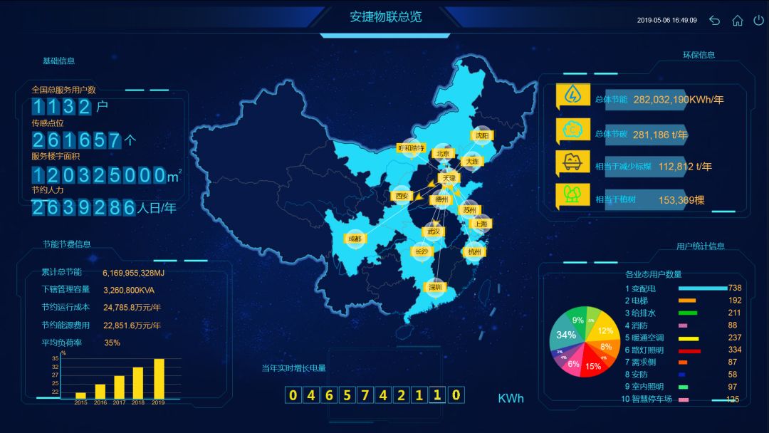 安捷能夠?qū)⒔ㄖ镏械淖冸娬?、空調(diào)、供熱、消防、安防、給排水、照明、電梯、地下停車場(chǎng)的動(dòng)態(tài)能全部集中到同一個(gè)平臺(tái)上;目前在全國擁有1000余個(gè)用戶,其中大多數(shù)為高端用戶;在用戶端安裝傳感器近27萬,每年節(jié)省運(yùn)維費(fèi)用和能源費(fèi)用超過5億元。